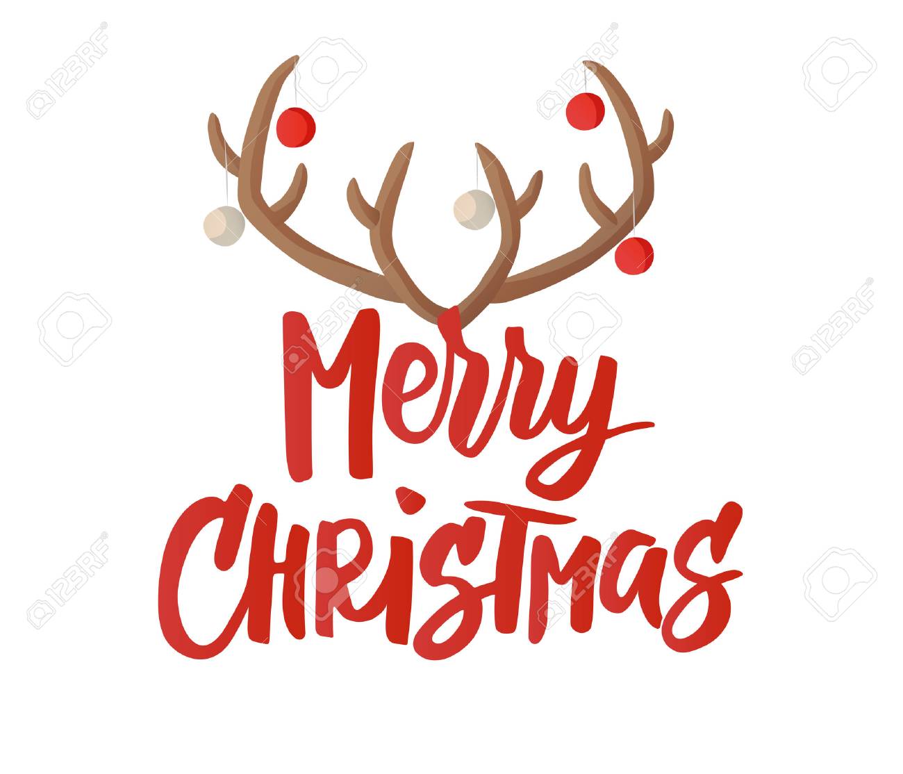 メリークリスマスカード手描きのレタリング クリスマスボールの装飾とトナカイの角 ギフトタグやラベルに最適です の写真素材 画像素材 Image